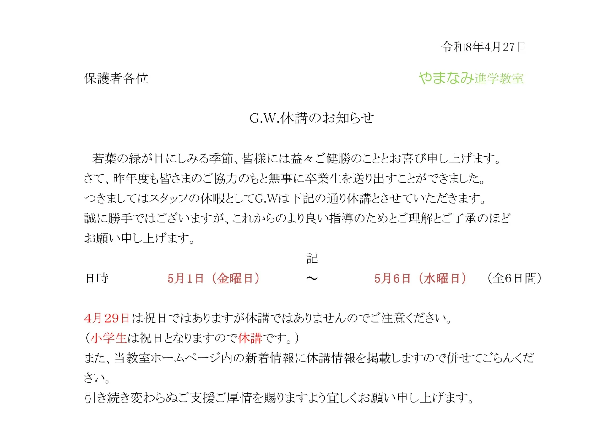 GW休講のお知らせ